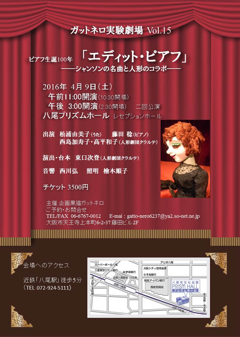 ピアフ生誕100年 「エディット・ピアフ」 ――シャンソンの名曲と人形のコラボ―― 午前公演 開場 10:30 開演 11:00 午後公演 開場 14:30 開演 15:00 チケット 3500円 会場:八尾プリズムホール レセプションホール 出演 松浦由美子(うた) 藤田稔(ピアノ) 西島加寿子・高平和子(人形劇団クラルテ) 演出・台本 東口次登(人形劇団クラルテ) 主催:企画黒猫ガットネロ (↑クリックすると拡大します↑) PR |