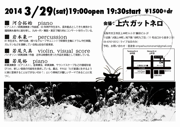 『即興演奏と映像楽譜の夕べ』 19:00open 19:30start ¥1500 (ドリンク別) 出演: 河合拓始 piano 岩本象一 percussion 若尾久美 violin, visual score(映像楽譜) 若尾裕 piano 詳細はこちら↓ http://ompasha.blog.shinobi.jp/Entry/183/ ★予約、お問い合わせ:音波舎 |